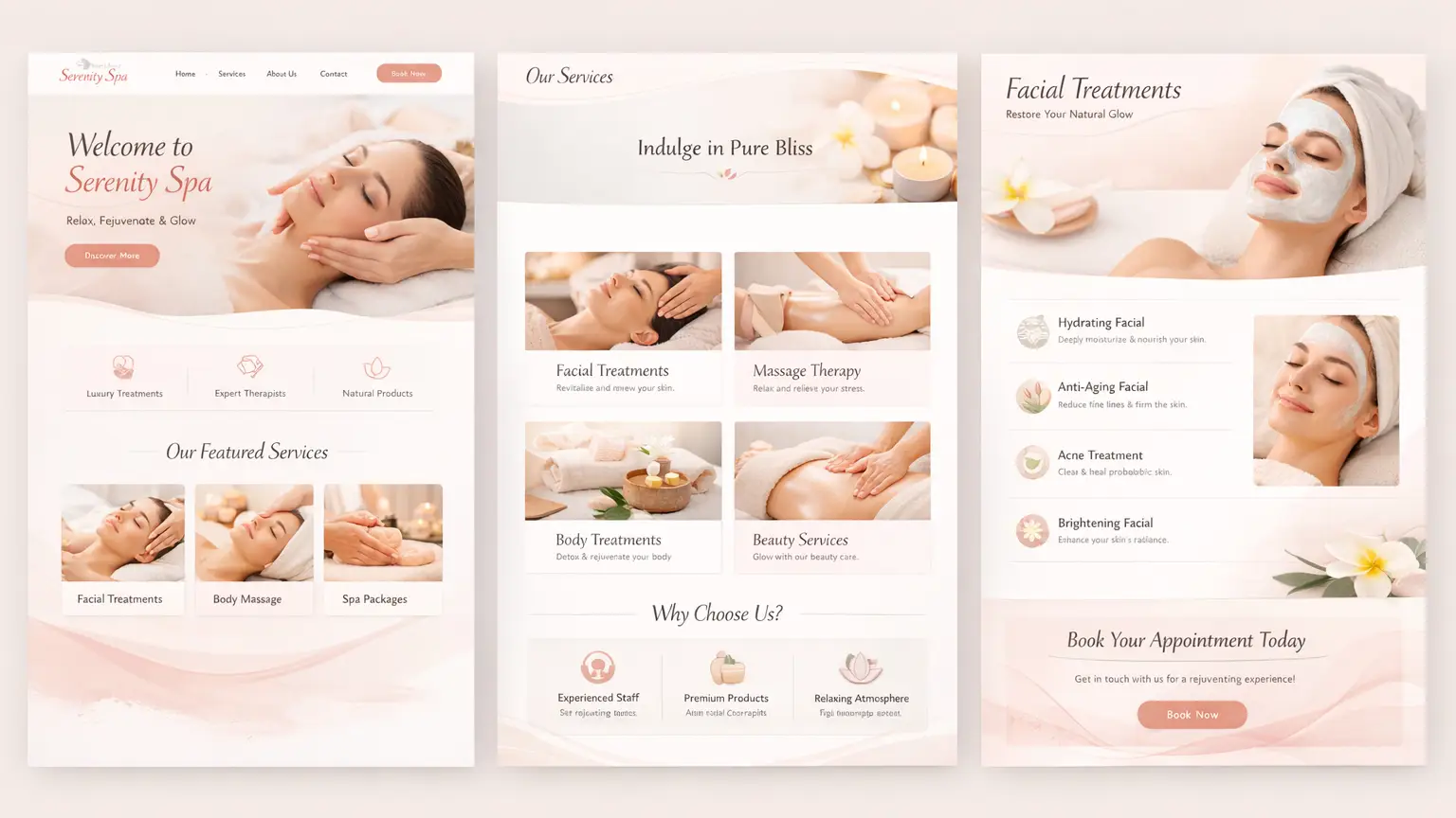Giao diện là yếu tố tạo ấn tượng đầu tiên với khách hàng, đặc biệt trong lĩnh vực spa nơi cảm xúc và cảm giác trải nghiệm được ưu tiên. Màu sắc thường dùng cho spa là pastel, trắng, be, nude, xanh lá nhạt hoặc xanh dương nhạt nhằm tạo cảm giác sạch sẽ, nhẹ nhàng và thư giãn.